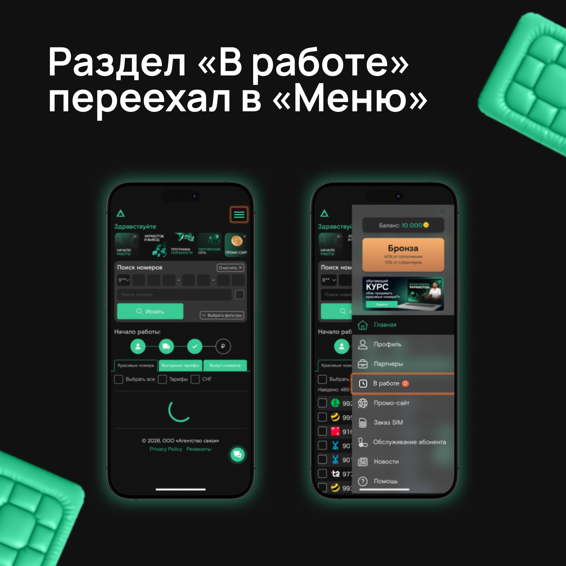 Мы перенесли раздел «В работе» с главного экрана в отдельный раздел «меню».